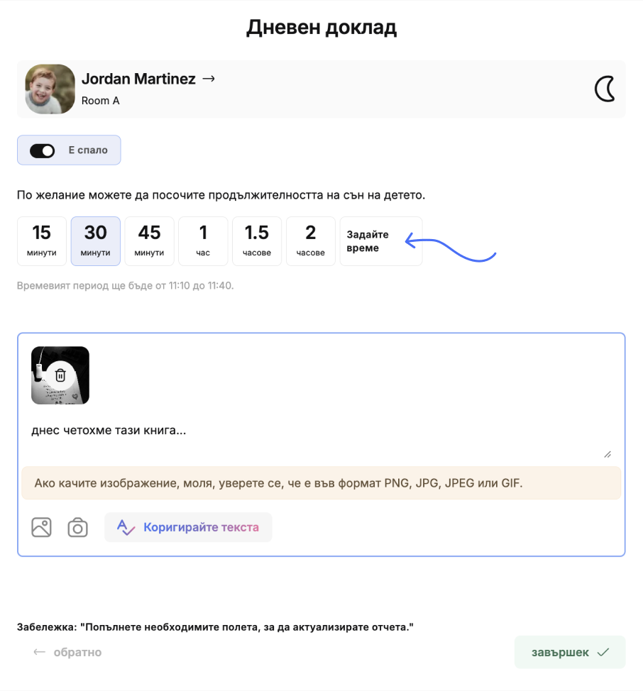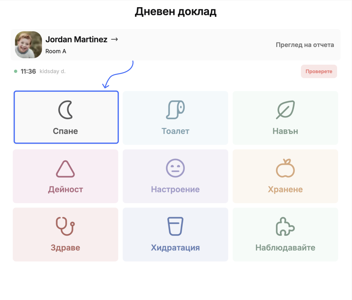 Приложението kidsday разполага със специално поле за отчитане на времето за сън и почивка, където педагозите могат да отбелязват:
