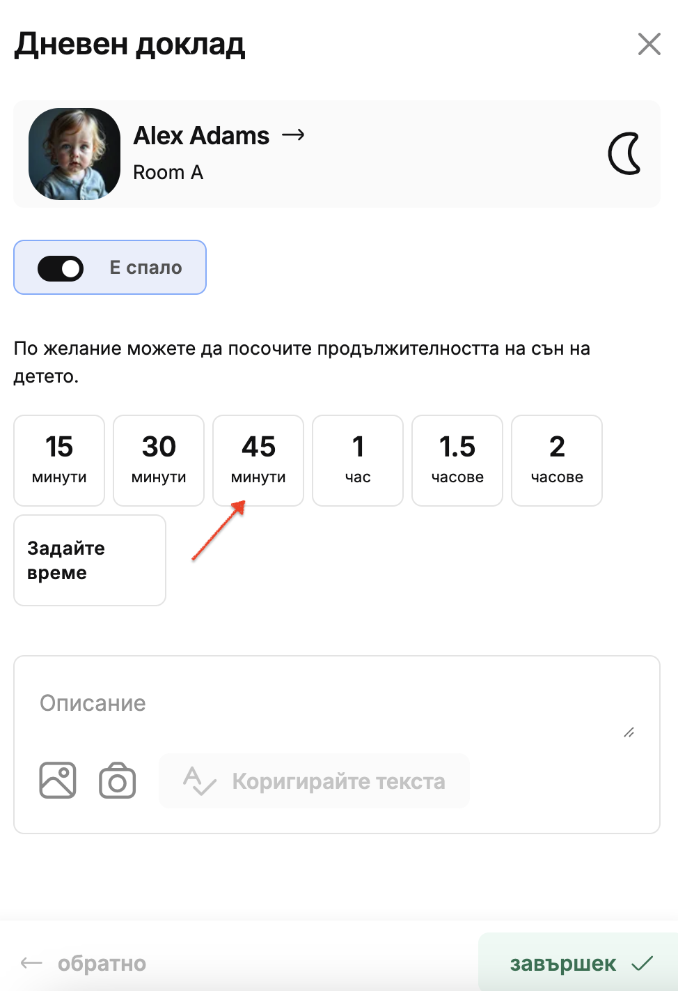 Ако желаете да докладвате за времето, през което детето спи, можете да изберете от предварително зададените времеви бутони (напр. 30 минути, 1 час, 1 час 30 минути).
