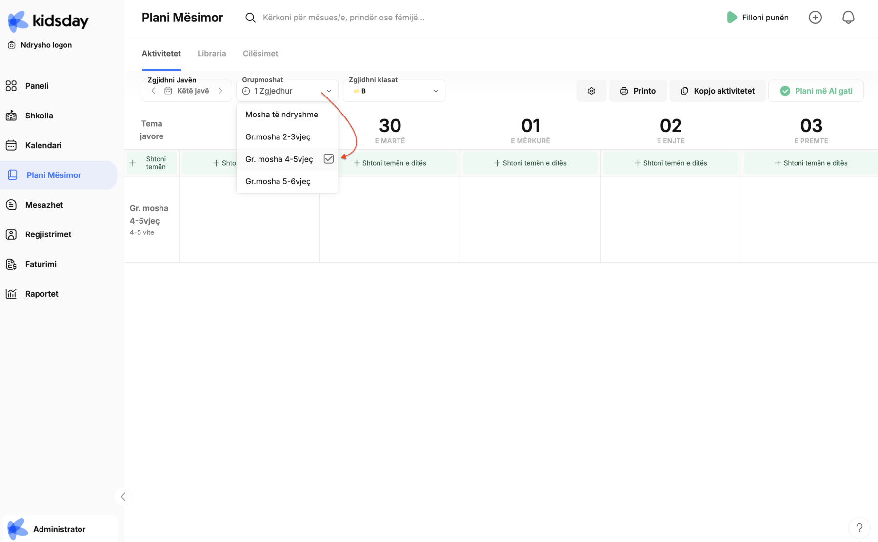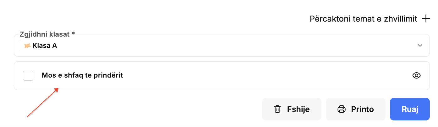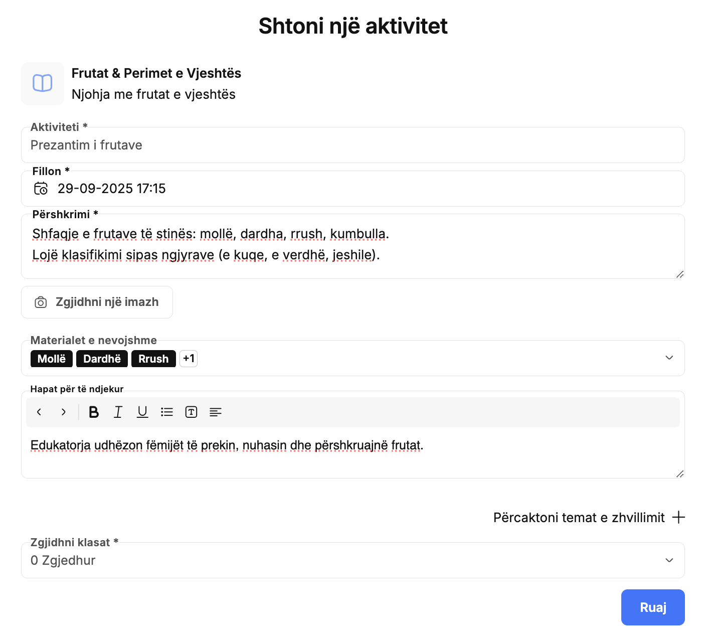 Zgjidhni klasën për të cilën do të planifikoni aktivitetet.